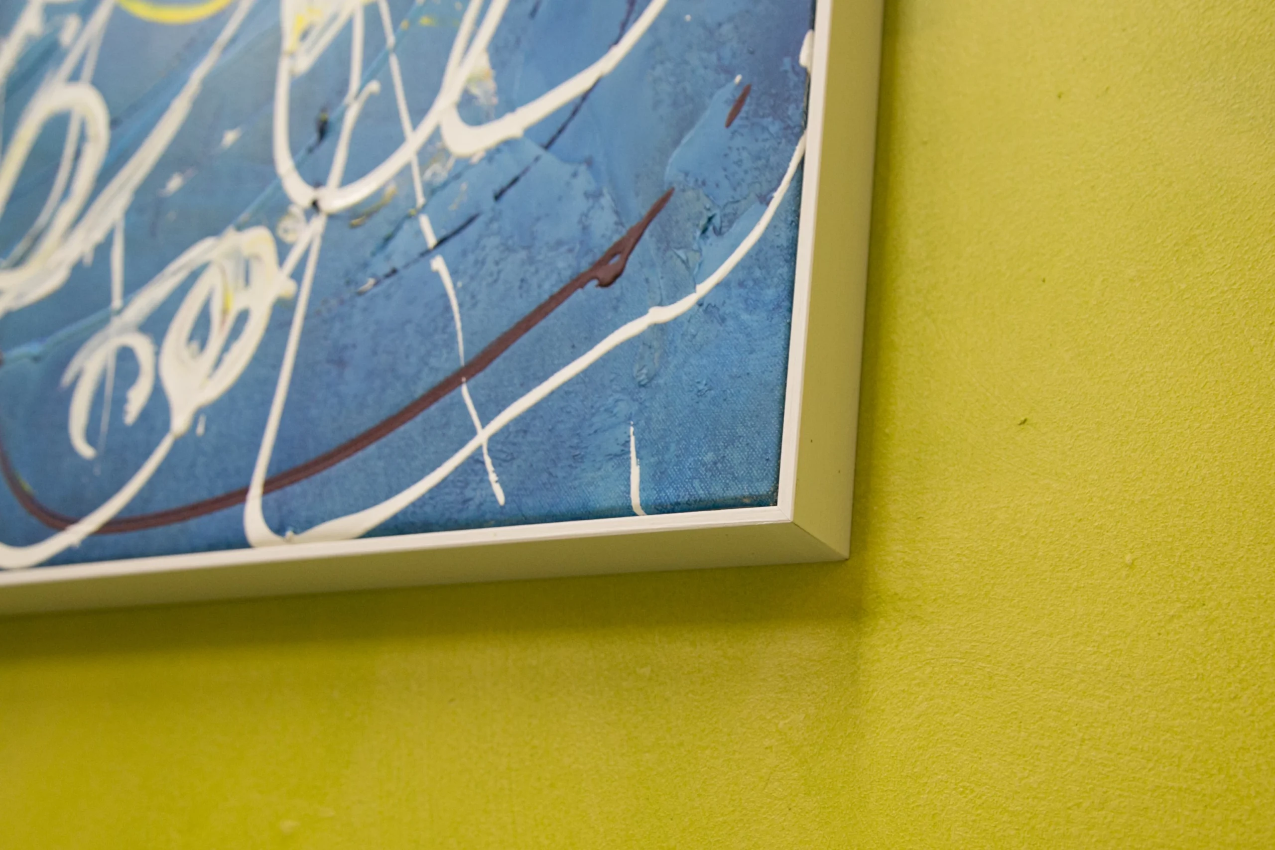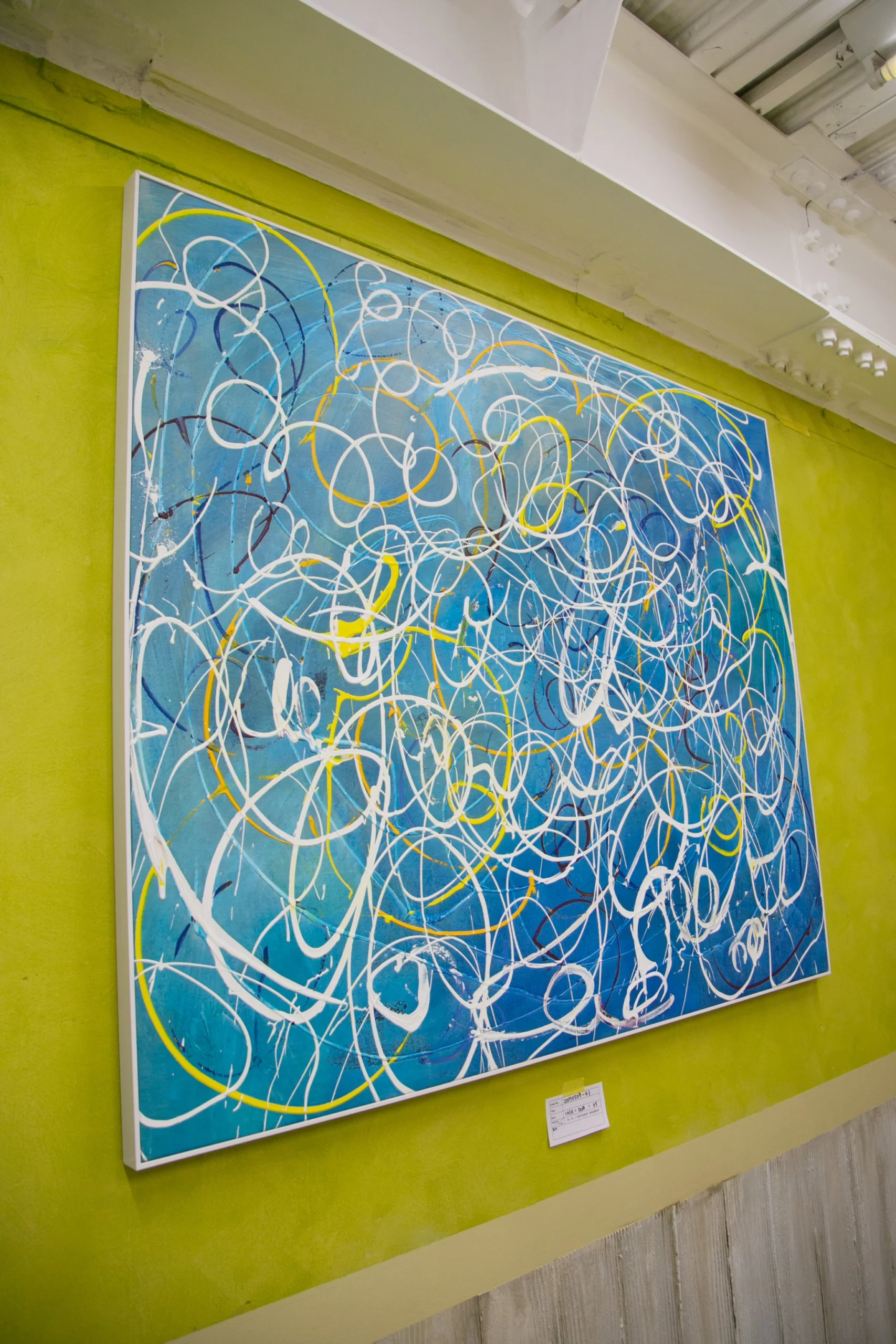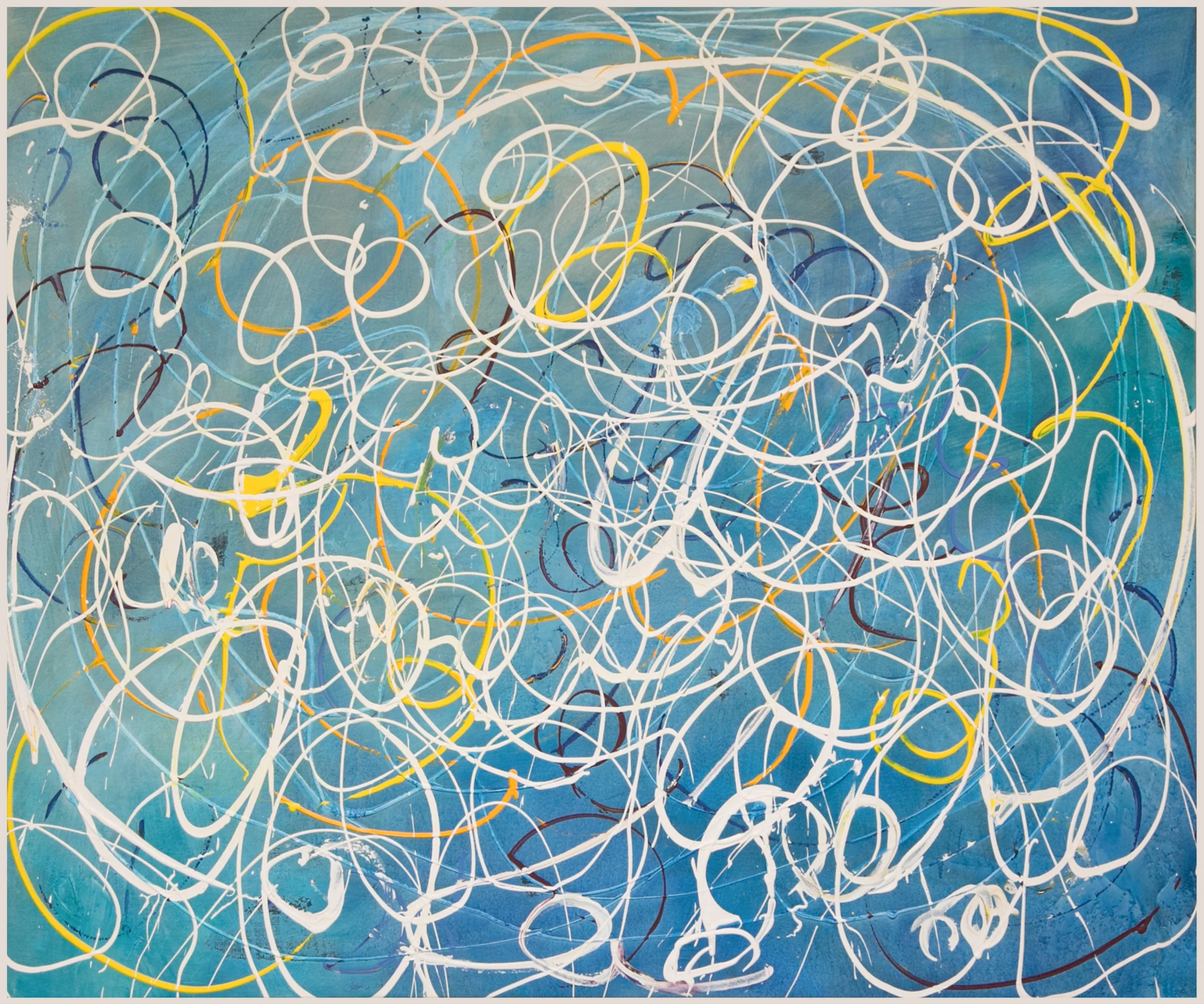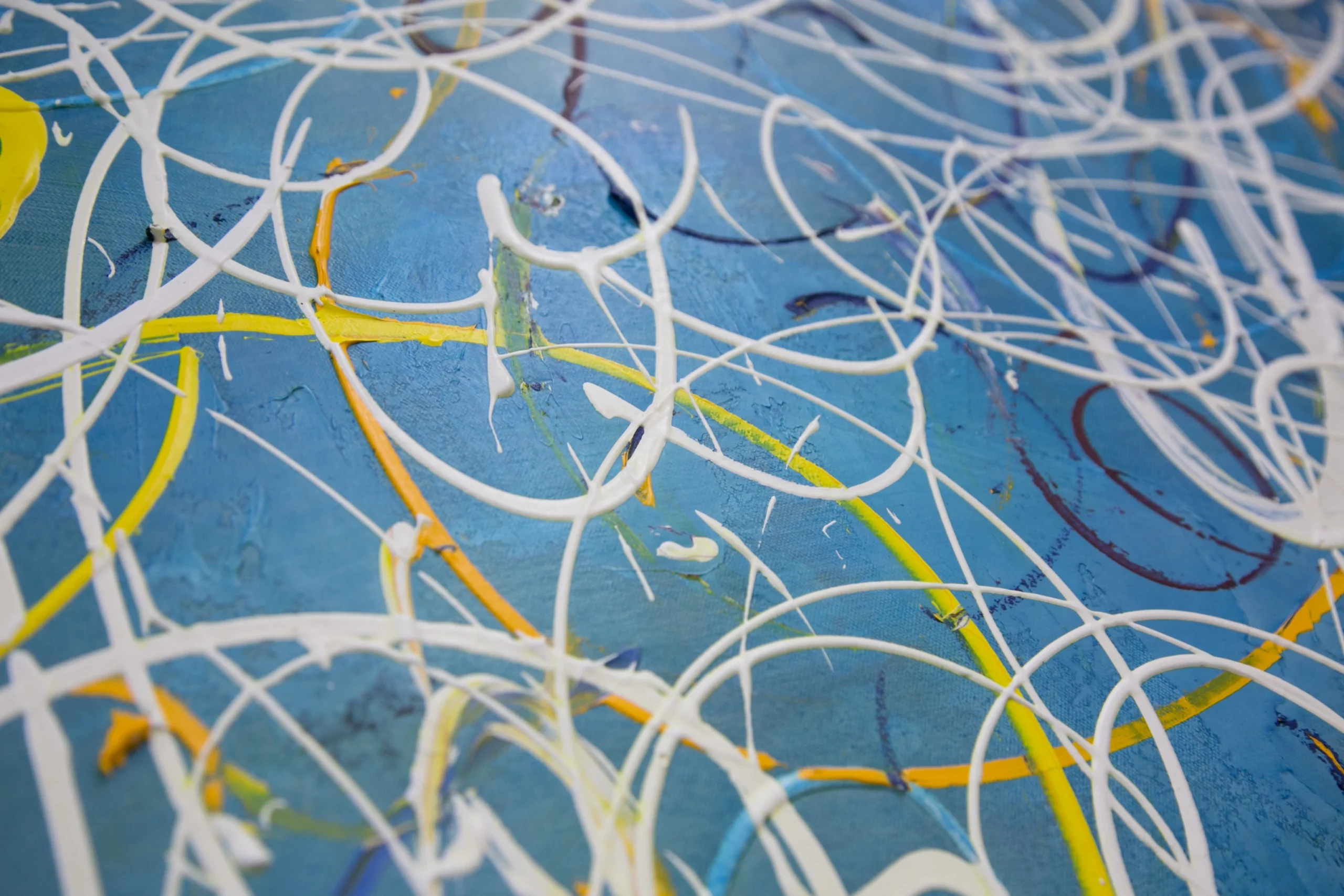 麻キャンバスの上に、チューブから直接出した絵具で、立体感や躍動感のあるラインを描いている。