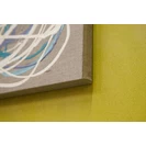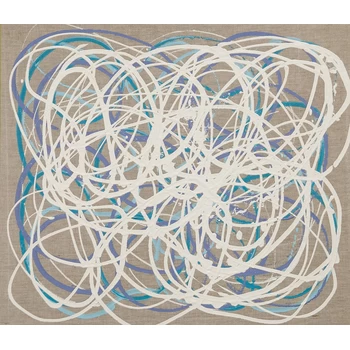 新宿髙島屋1Fの天井画に描いた時に出来たシリーズ「つなぐ」。 今までは絵具の中に存在していたラインが今度は画面にとびだすように描かれた。 麻キャンバスの上に、チューブから直接出した絵具で、立体感や躍動感のあるラインを描いている。