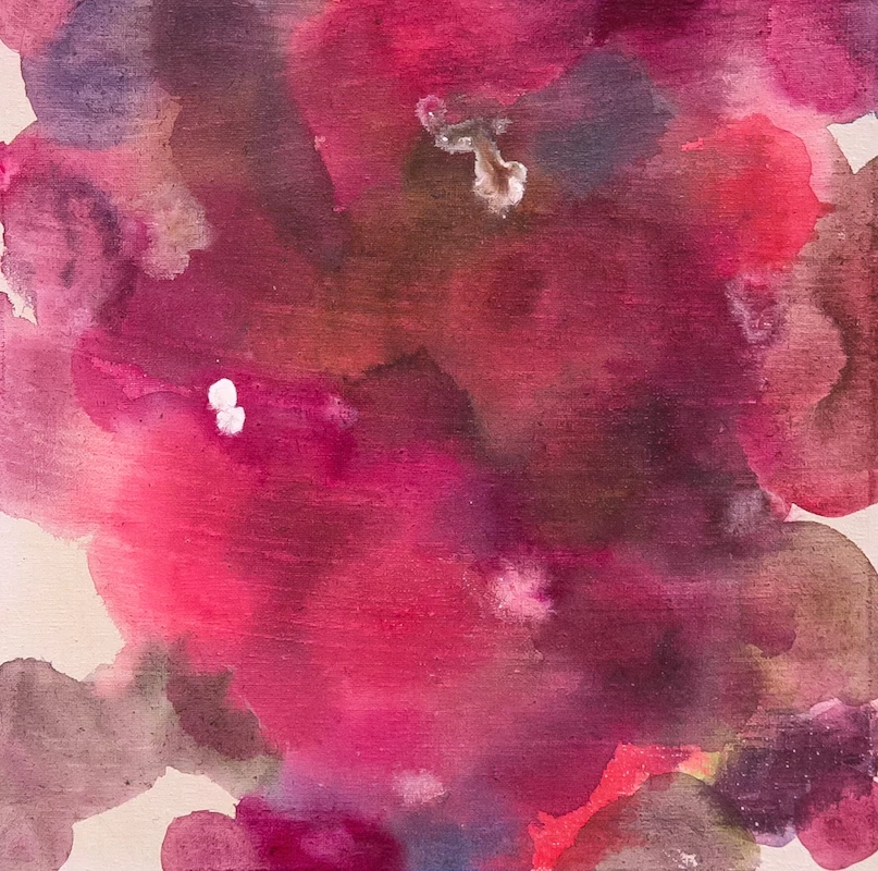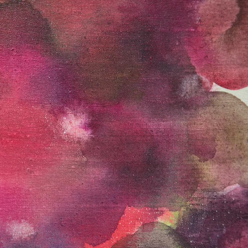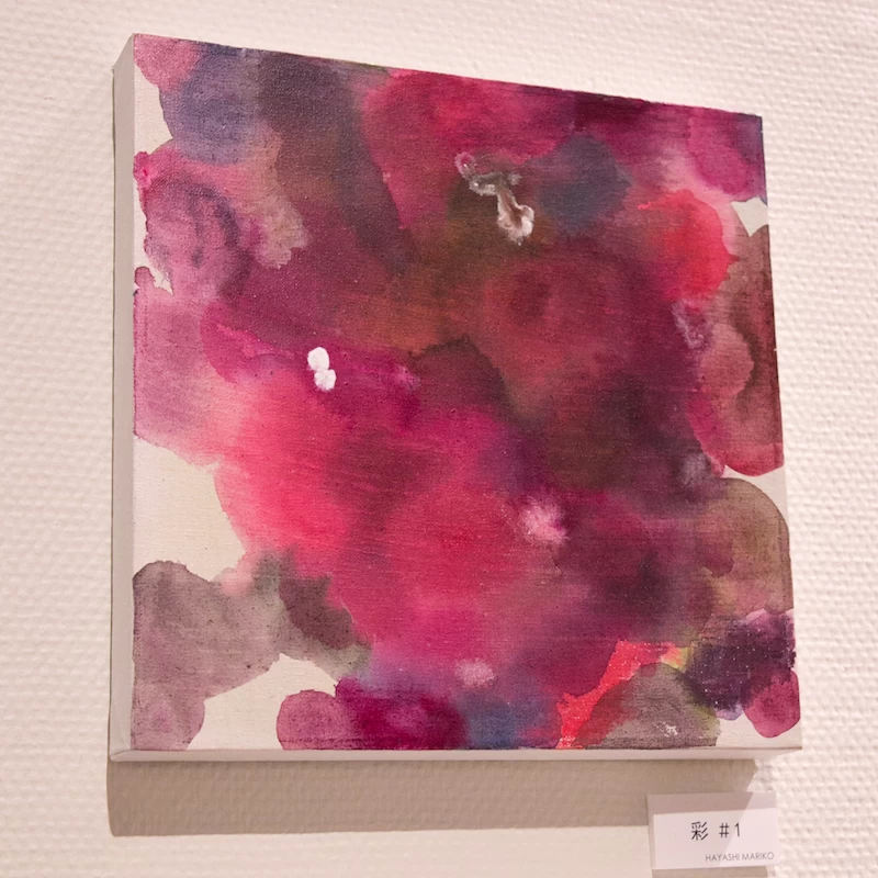 透明度が高い画材で何層にも描き、透明感のある花をイメージした円形のものが幾重にも奥行きをなして存在する作品。