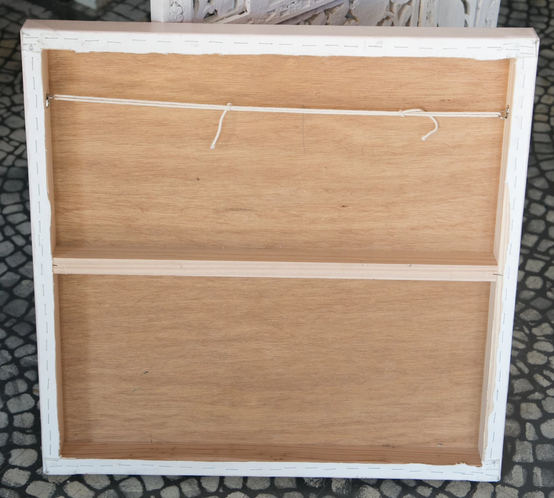木どっことは、作品を壁面に安定して取り付けるための木製の仕込みで、紐と違って前に傾く(お辞儀する)ことがなく、美しい展示が可能です。